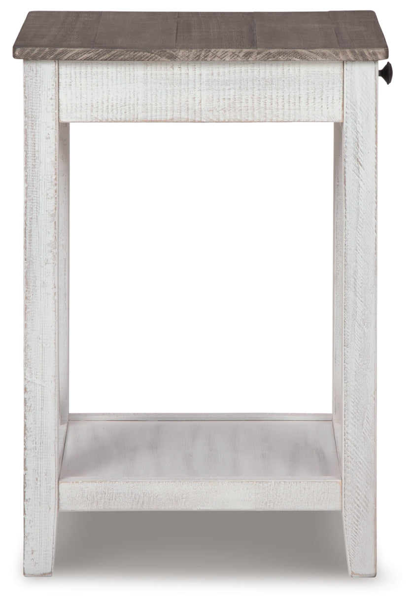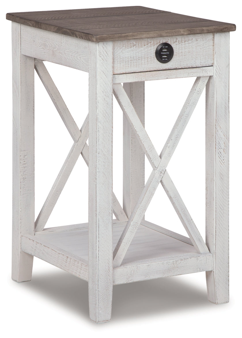 Modern meets vintage in this accent table. Made of wood, it creates a vintage vibe with a distressed white and gray finish and crossbuck supports on two sides. Two USB charging ports add modern function. This is a must-have piece for your living space.