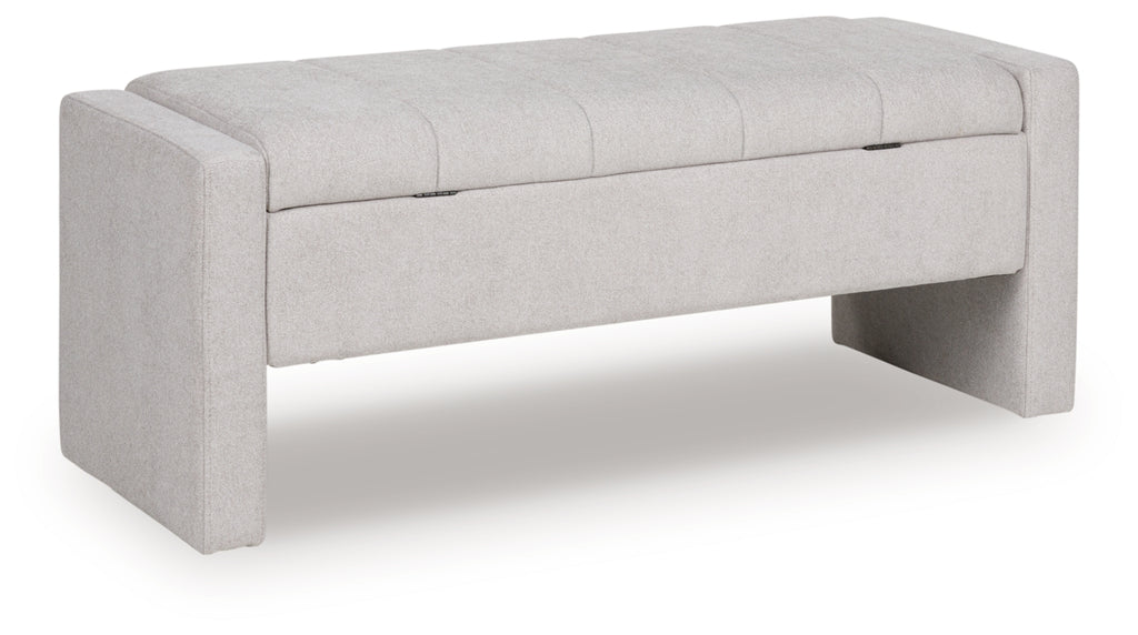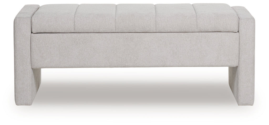 Whether gracing an entryway or sitting pretty in a main living area, this comfortably cushioned upholstered storage bench is packed with possibilities. Its clean, unfussy silhouette strikes a highly contemporary pose. Lift the hinged seat to reveal ample storage for your pillows, throws and everything in between.