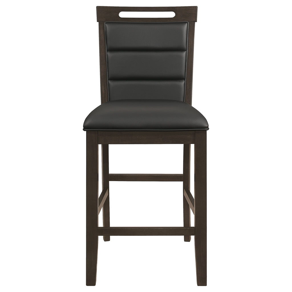 Instill a luxurious sensibility in your kitchen or lounge with a five-piece modern counter height dining set. Designed for stylish appeal in any setting, it pairs a luxurious white marble tabletop with a classic trestle base table, creating a compelling combination of style and color. Metal details add depth to the trestle base, while its counter height offers casual appeal in your stylish home. Chairs feature a complementary dark brown color scheme, complete with foam cushions and faux leather upholstery with channel tufting to create a sense of structure. Chair backs add cutout handles for easy movement, and built in footrests provide optimal comfort and support for family and friends.
