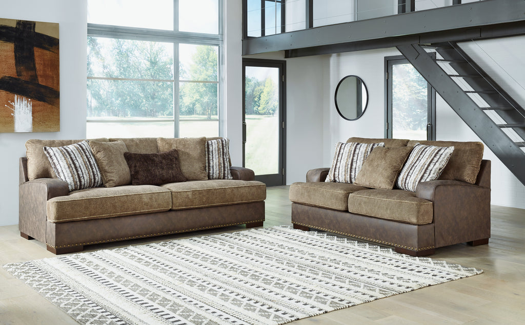 Punctuated by a subtle band of nailhead trim, this sofa is perfect for those who love the look of leather. Two textural tones provide twice the style and comfort—and incorporate an added layer of visual interest. Throw pillows add a fun decorative element. Loveseat, oversized chair and ottoman included.