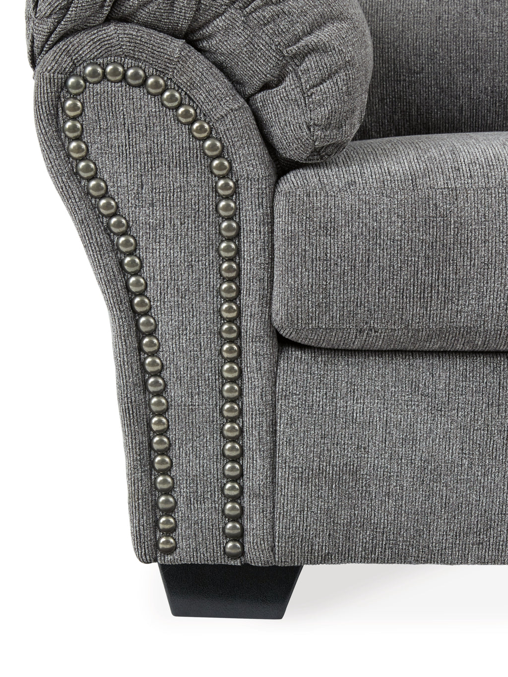 Why sacrifice comfort for style (or style for comfort) when you can have the best of both in this living room set with sofa, loveseat and rocker recliner in pewter gray. Elements include a chic divided-back design and pillow top wrapped armrests that make nodding off all too easy. Calling attention to the elegantly flared armrests—black nickel-tone nailhead trim for a punch of cool character.