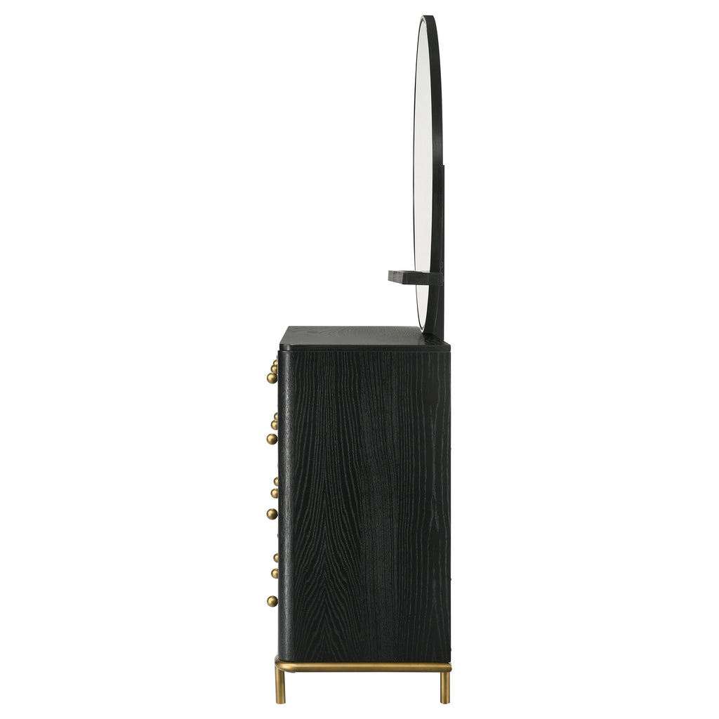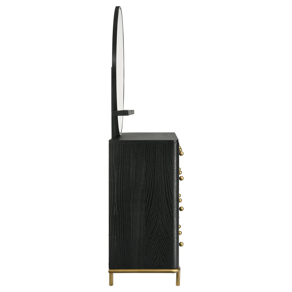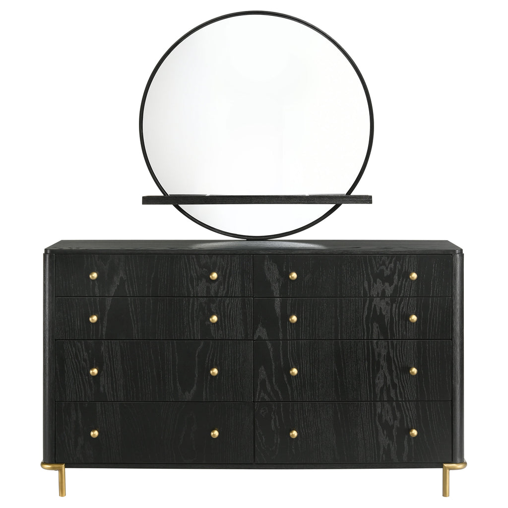Step into a world of understated elegance with the mid-century modern eight-drawer dresser, its wire-brushed sand wash finish providing a serene backdrop to the aged brass accents. The sleek design, with softly rounded corners and slender legs, offers a sophisticated aesthetic while ensuring ample storage. The felt-lined top drawers cater to your delicate belongings, blending functionality with thoughtful design. Above, the modern dresser mirror, complete with a built-in tray and spacious round reflection, maximizes your space, allowing for a clutter-free surface and a tranquil bedroom escape.
