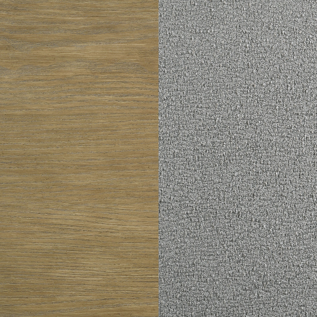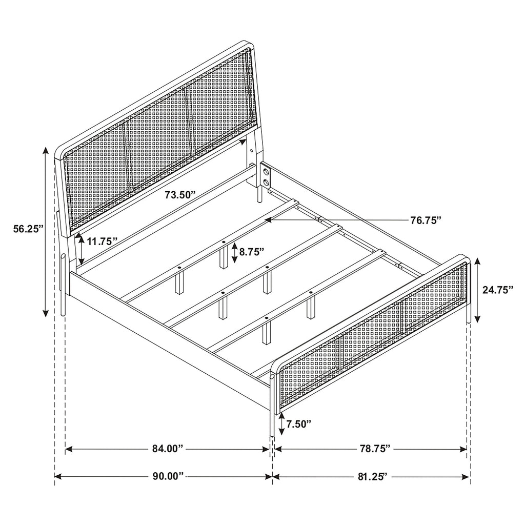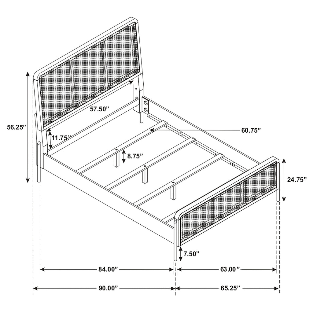 Elevate your retreat with this mid-century modern panel bed, designed with a textured wire-brushed sand wash finish across its grey fabric upholstered headboard and footboard. Aged brass metal legs lend a metallic accent that lends a glamorous touch.