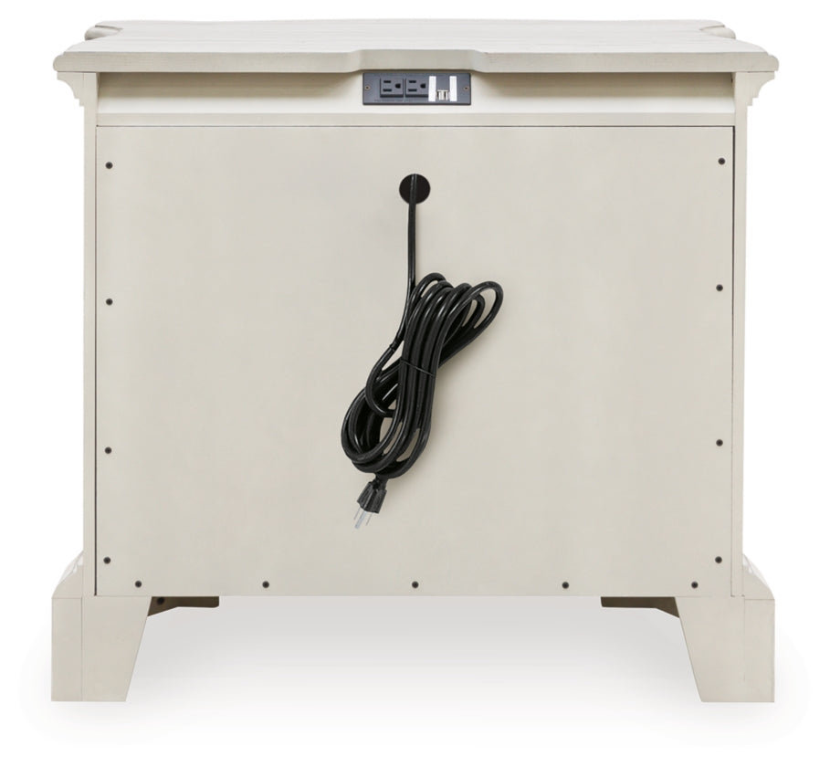 - Three drawer night stand with integrated 110V power supply with dual USB charging ports.