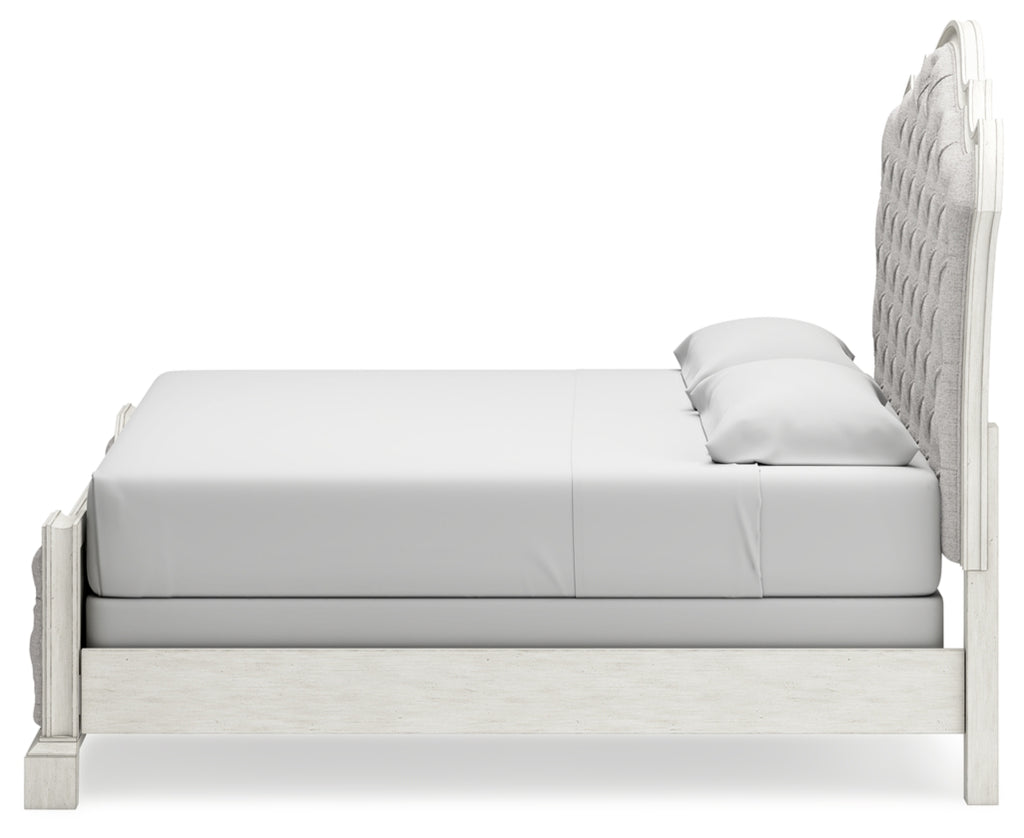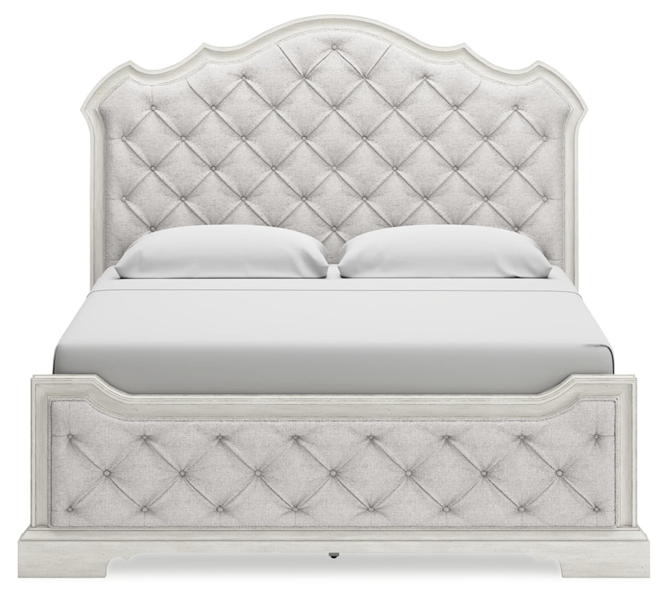 Add a touch of romance to your home with this queen upholstered bed. The antiqued white painted finish and serpentine-shaped silhouette details are the picture of easy elegance. Indulge your love of luxury with decadent button-tufted cushioning from head to toe.