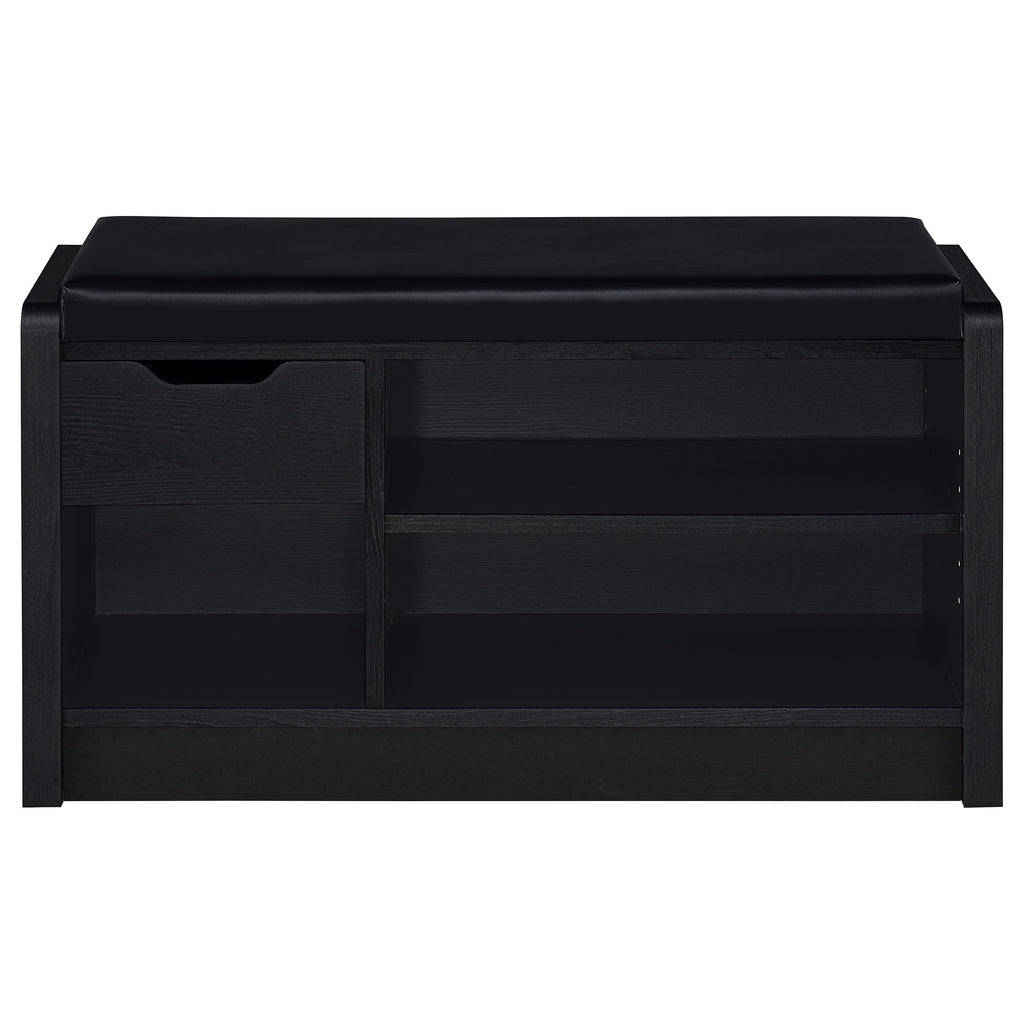 Make your entryway or garage both functional and stylish with this versatile storage bench, designed to keep your space organized. Featuring a foam cushion upholstered in sleek black faux leather, this bench offers a comfortable seat while you put on or take off your shoes. The engineered wood frame, finished with an eco-friendly laminate, offers durability with a modern appeal. The storage includes a pull-out drawer, an adjustable shelf, and an open compartment, perfect for organizing shoes, bags, or other essentials. This bench ensures all your entryway necessities are easily accessible.