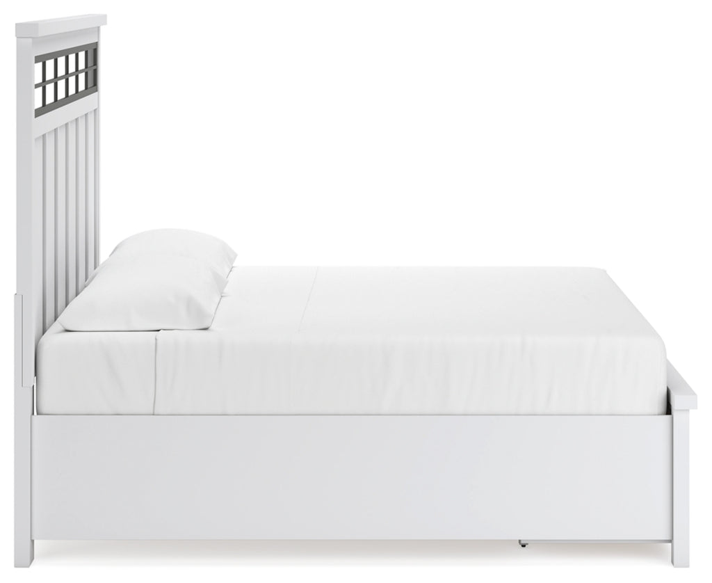 - Farmhouse panel storage bed features a stylish board and baton effect with an inset metal barn sash for a unique take on farmhouse design.