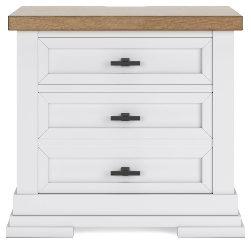 - Three drawer nightstand includes a 110V power supply with dual USB charging ports.