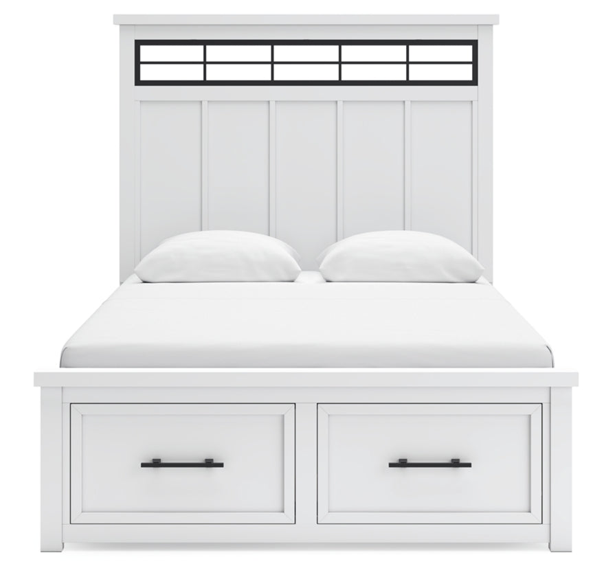 This queen panel storage bed delivers casual style with substance. An inset metal detail on the headboard displays a unique take on modern farmhouse design. The bed's sturdy silhouette, classic white finish and black pulls exude a comfortably cozy vibe in your soothing sanctuary. Storage drawers are spacious enough for all your essentials. Dresser, mirror and nightstand included.