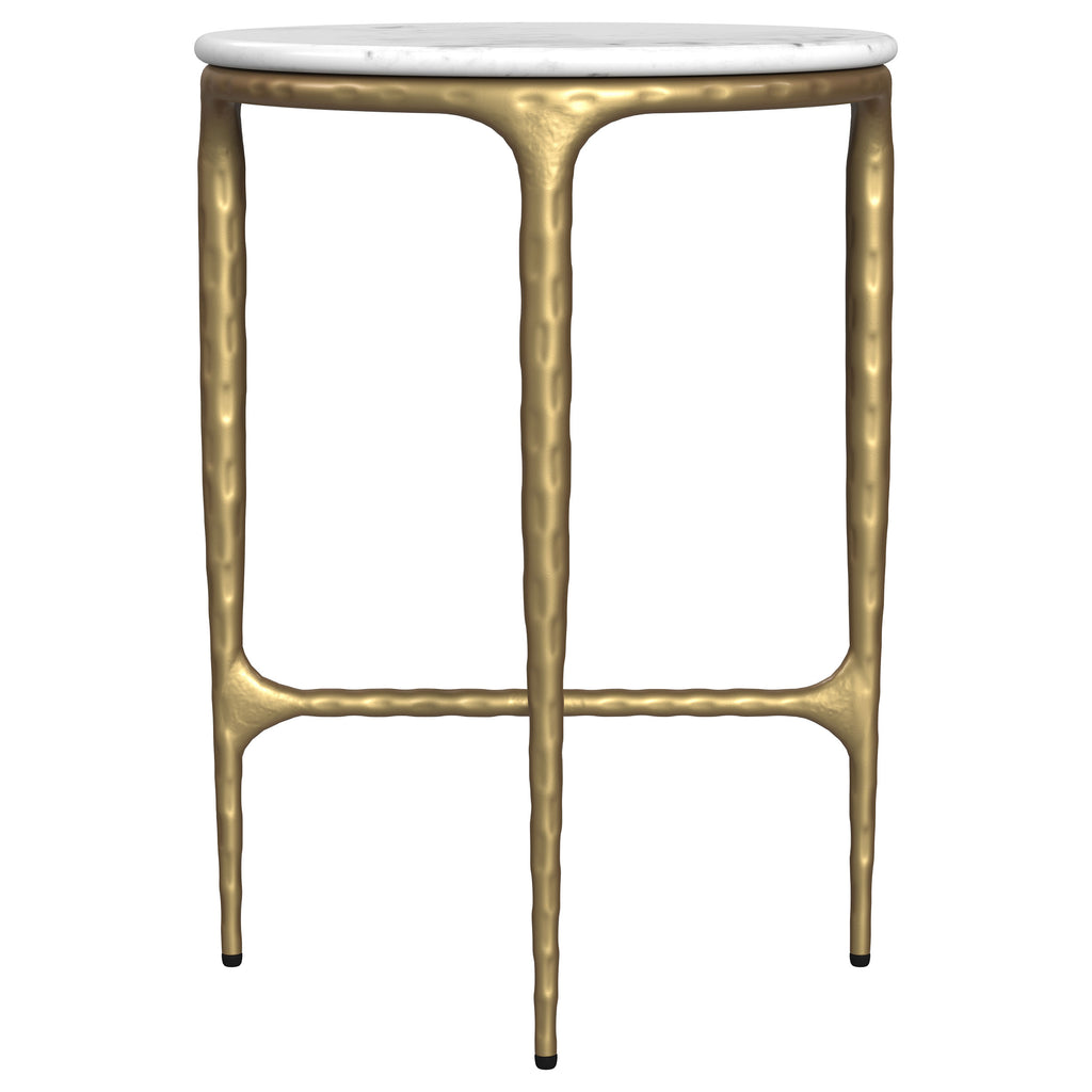 Introduce an artistic touch to your home with this stunning round side table, where luxurious materials and sculptural design meet. The table boasts a genuine white marble top that sits gracefully atop a hand-hammered steel frame with a rich gold powder-coated finish. The organic texture of the frame adds an intriguing contrast to the smooth marble, offering a piece that’s both functional and visually striking. Perfect for contemporary and eclectic interiors, this round side table arrives fully assembled, making it an effortless addition to your living space.