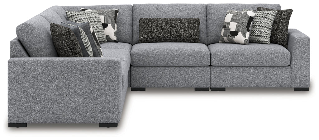 - Includes 5 modular pieces: left-arm facing corner chair, 2 armless chairs, wedge and right-arm facing corner chair