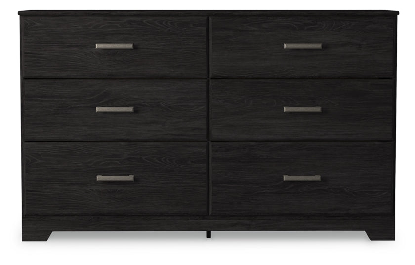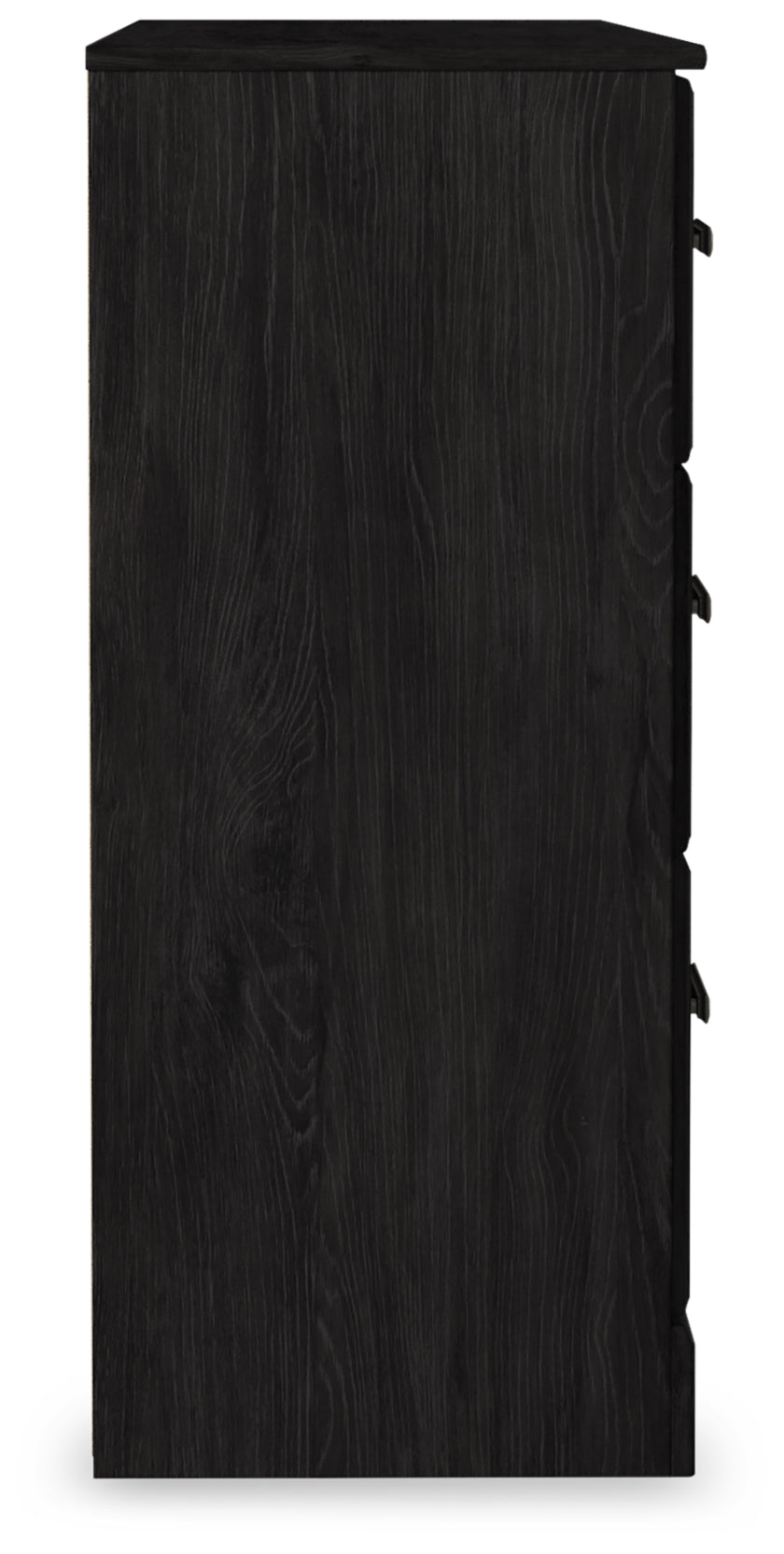 With its clean-lined look and modern attitude, this king panel bed is a fresh style awakening. A warm charcoal hue over replicated oak grain easily complements other furniture finishes. The simple, unadorned profile is given depth and dimension with the addition of plank-style moulding on the headboard—proof that beauty lies in the details. Dresser, chest and 2 nightstands included.