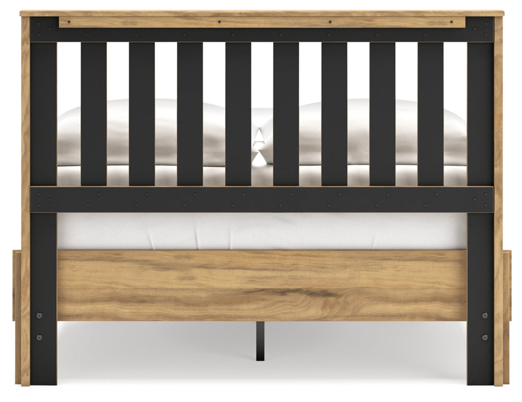 This full platform panel bed puts the dream of a casual bedroom retreat beautifully within budget. Its warm light brown finish over replicated hickory grain exudes a homey vibe. Slatted detailing on the headboard incorporates rich dimension. It’s a simply relaxed way to achieve the bedroom of your dreams without needing a foundation or box spring.