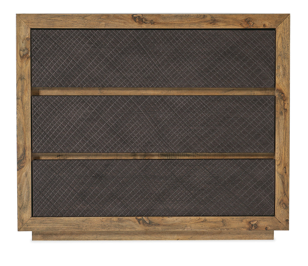With a simple and straightforward silhouette that evokes the heritage of artisan craftsmanship, the Big Sky Bachelor’s Chest boldly contrasts a Vintage Natural wood case with a crosshatch texture on the drawer fronts in the charcoal Furrowed Bark finish. With three self-closing drawers, the top drawer has a removable felt liner. Both top drawers have finger grooves for opening on the drawer bottoms and the bottom drawer has finger grooves on top of the drawer and is cedar-lined. There’s an FC707 power bar with 3 electrical outlets and one live USB port, along with a cord clip on the back.