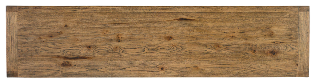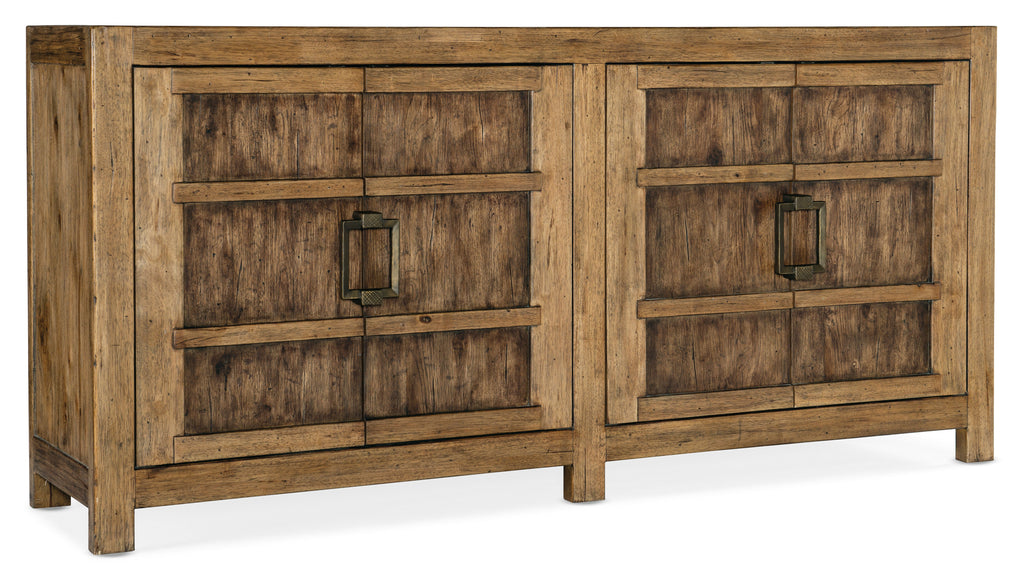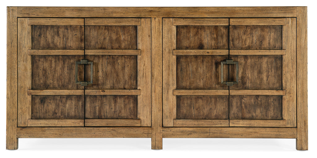Warm and rustic with a silhouette that evokes the weight, heft and heritage of beam construction, the Big Sky Buffett is crafted of Pecky Hickory Veneers with a solid wood edged top. The buffet is finished in Vintage Natural, an organic finish that reveals the authentic knots and wood grain patterns. The four doors have soft-close hinges, and there’s one self-closing drawer and one adjustable shelf behind each pair of doors. The right side drawer has a removable felt liner and the left side drawer has a removable silverware tray. The interior is finished in Charred Timber, inspired by the restorative beauty of a fire-ravaged forest.
