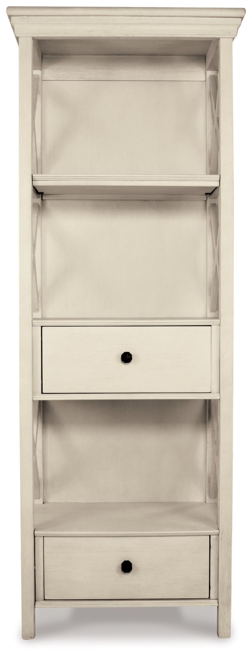 - The tall bunching unit has two drawers, three shelves and open lattice sides.