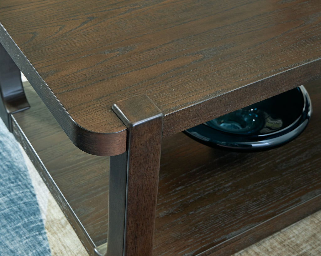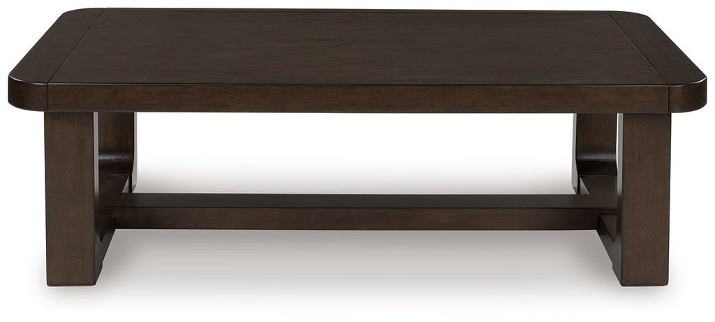 If casual contemporary style is your thing, then you'll love this coffee table. Its thick solid wood edge, softly rounded corners and dark wood-tone finish lend a soothing sensibility. Sleek and stylish, this piece is a fresh take on cool for the modern home.
