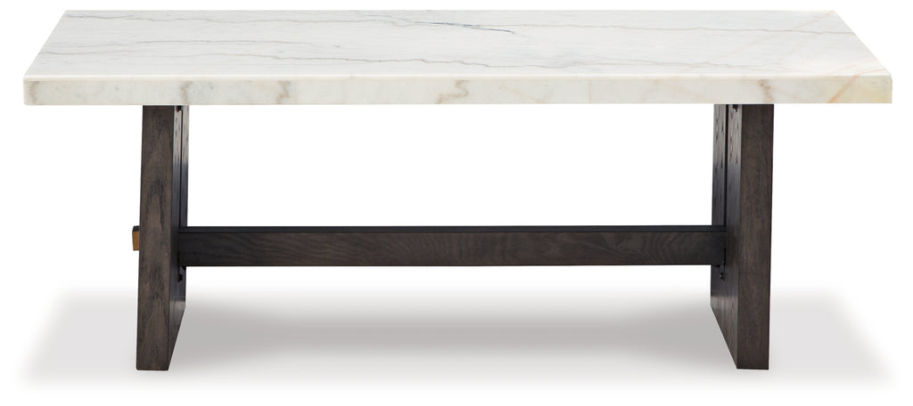 Dressed to thrill, this simply stunning coffee table offers a high-design look at a down-to-earth price. Ultra-sleek lines are accentuated with a dark waxy brown oak finish that’s so easy on the eyes. Clean-lined and modern, the plinth base and natural marble tabletop showcase quality craftsmanship and attention to detail. This table is the perfect centerpiece for a living room or family space, with a timeless look that's made to last. 2 end tables included.