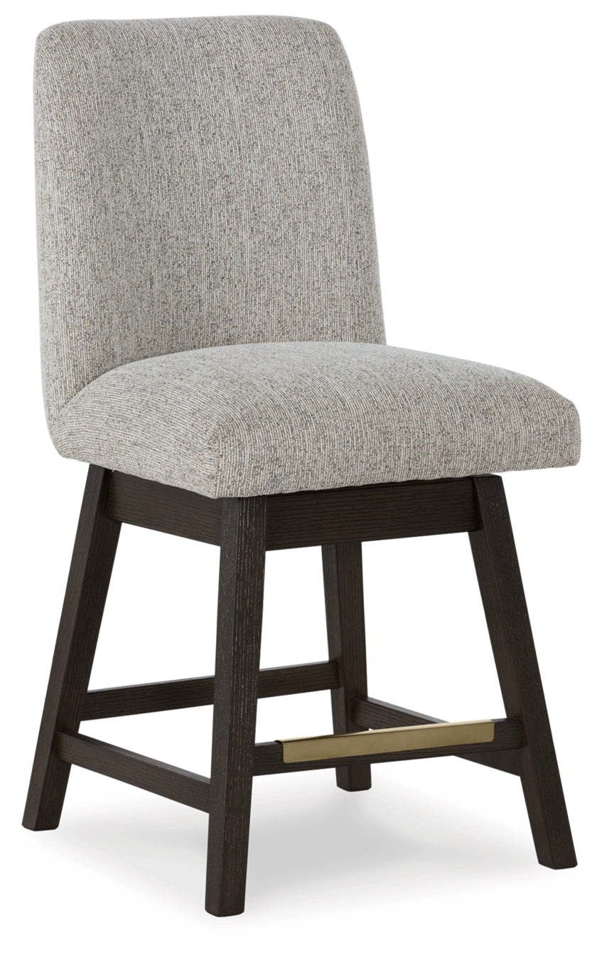 Dressed to thrill, this counter height bar stool set offers a high-design look at a down-to-earth price. Ultra-sleek lines are accentuated with a dark waxy brown oak-tone finish that’s so easy on the eyes. Suitably upholstered in a tweed-like neutral fabric, the softly contoured back design is tailor-made for comfort. Whether it's part of a dining arrangement or used as extra seating, this timeless bar stool has a look that’s made to last.