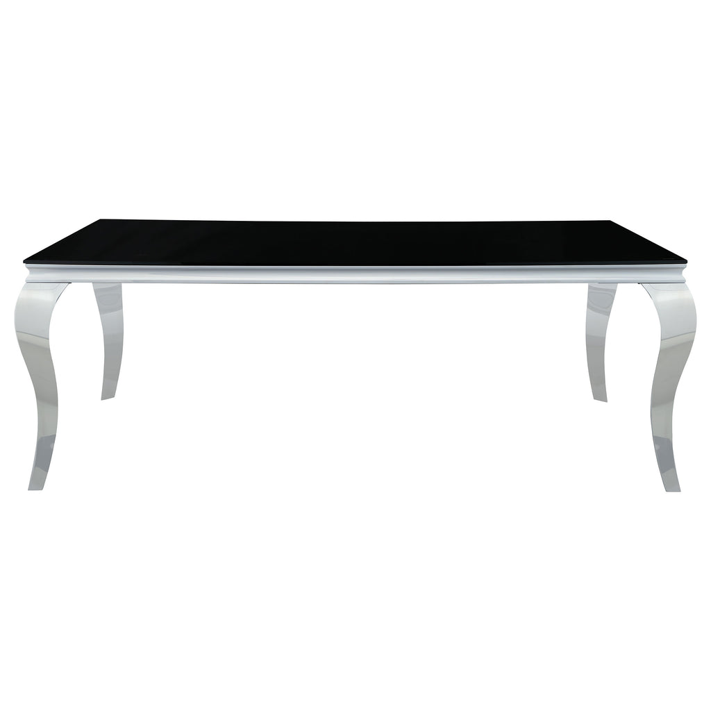 Experience the Carone dining set, seamlessly fusing modern design with timeless elements. The table's stainless steel legs bring sophistication, curving artistically and contrasting the 12mm tempered glass top with beveled edges. Hosting formal feasts is effortless on this table. Complementing this, the elegant dining chairs exude sleek sophistication. Their chrome-finished legs, including creatively curved front legs, offer a captivating shine. Luxe velvet upholstery graces the seats, available in various colors to personalize your space. Elevate your dining area with the Carone collection, where innovation meets opulence.