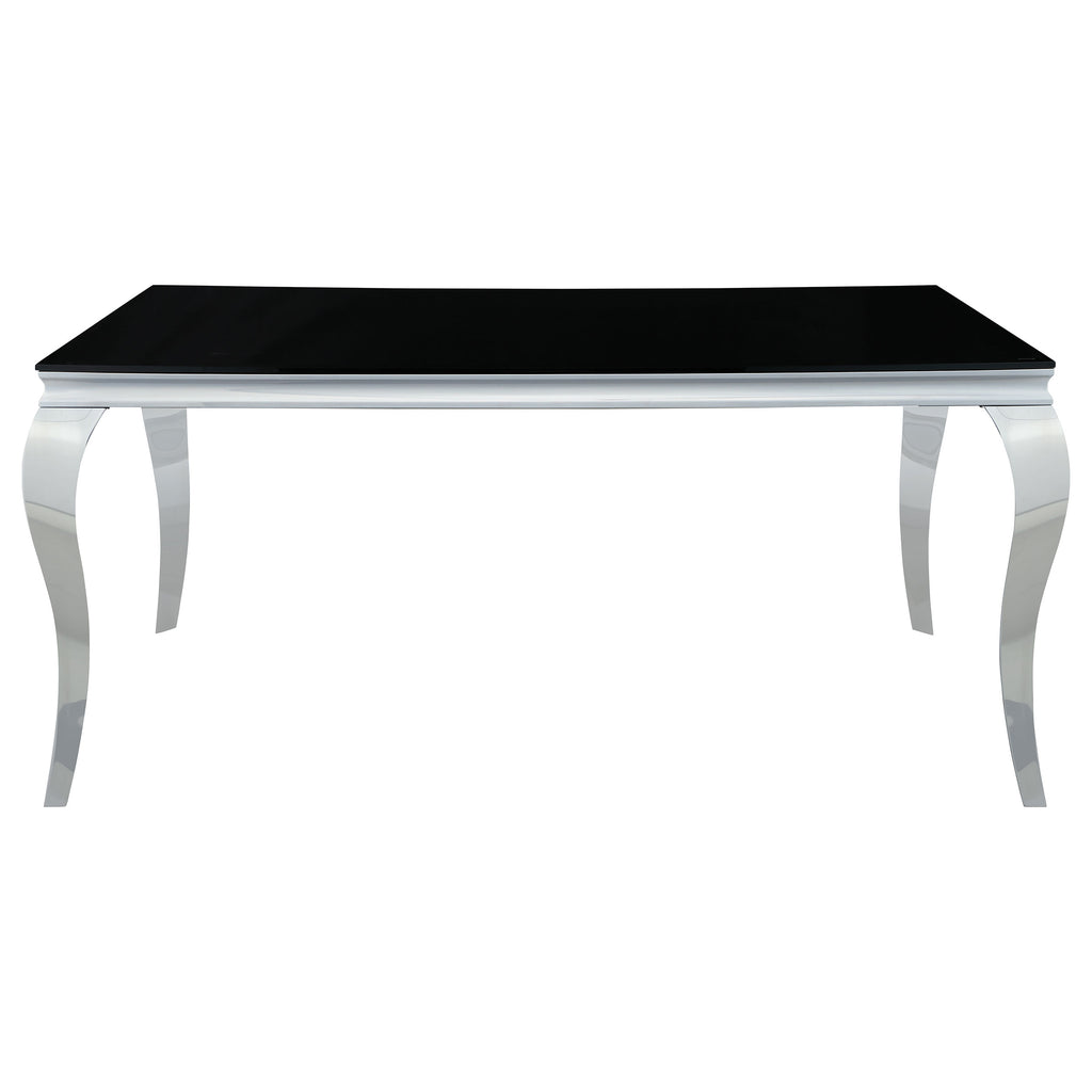 Experience the Carone dining set, seamlessly fusing modern design with timeless elements. The table's stainless steel legs bring sophistication, curving artistically and contrasting the 12mm tempered glass top with beveled edges. Hosting formal feasts is effortless on this table. Complementing this, the elegant dining chairs exude sleek sophistication. Their chrome-finished legs, including creatively curved front legs, offer a captivating shine. Luxe velvet upholstery graces the seats, available in various colors to personalize your space. Elevate your dining area with the Carone collection, where innovation meets opulence.