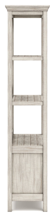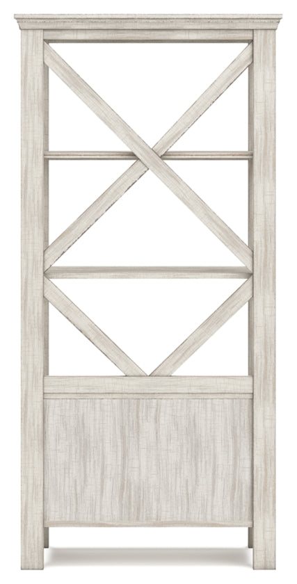 - Accent bookcase has cross buck support structure behind the shelves.