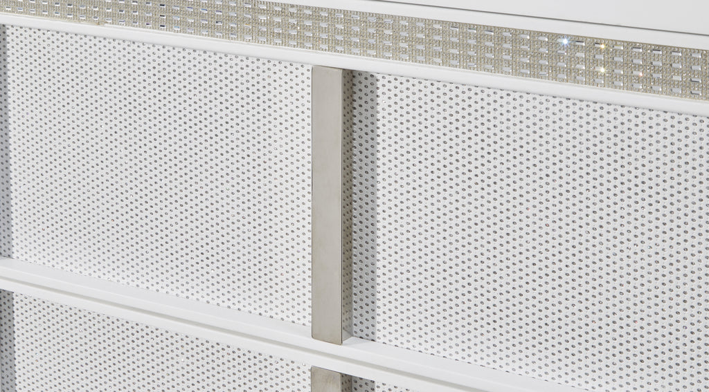 - Bright white, smooth lacquer finish is beautifully accented with contemporary rhinestone frames and textured PVC drawer fronts.