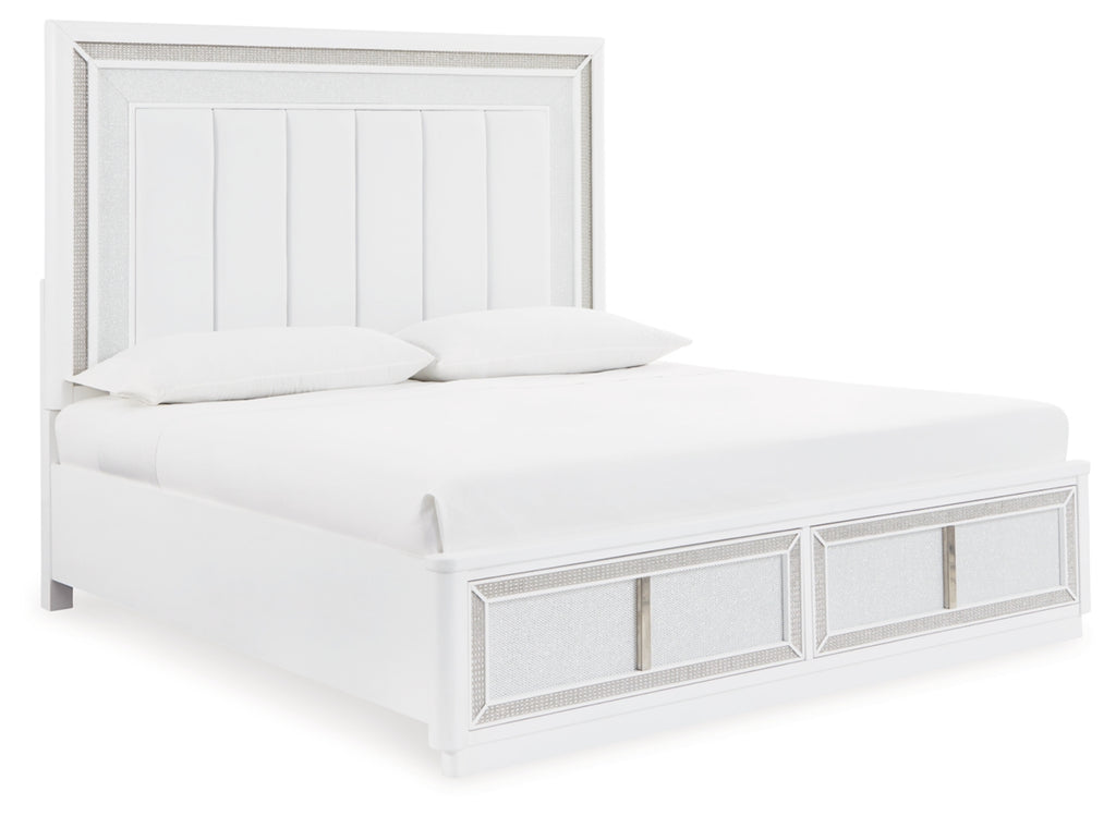 - The storage panel bed features an inset channeled headboard cushion covered with a durable white faux leather.