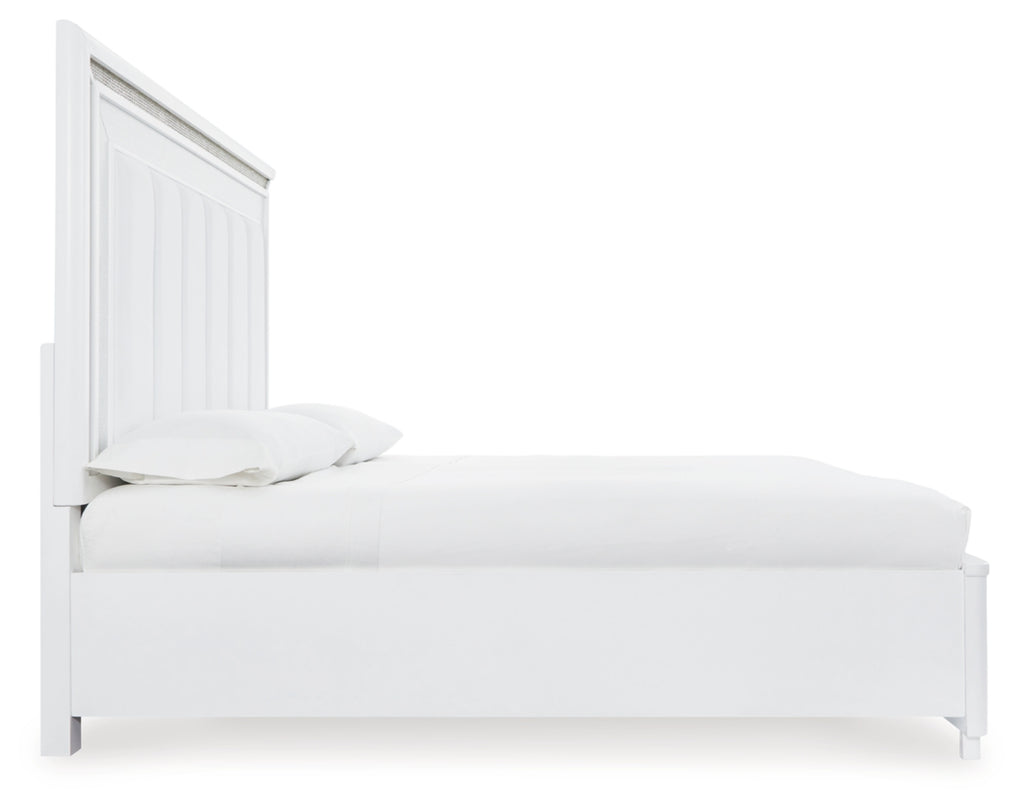 - The storage panel bed features an inset channeled headboard cushion covered with a durable white faux leather.