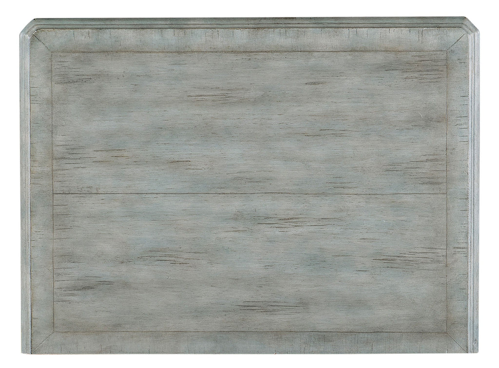 Capturing the vintage charm of coastal locales, the Charleston Two-Drawer Accent Table has an arched design between the understated cabriole legs and framed door fronts. Crafted of Hickory Veneers with solid wood tops, the table is finished in Waterscape Blue, a stain and paint combination with a transparent blue-green coloration, allowing you to see into the natural grain of the wood. The decorative bail pulls have an antique pewter finish with white hang up. Two self-closing drawers.
