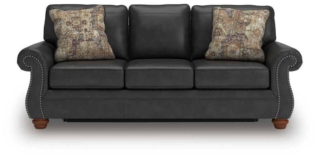 Everyone can have the best rest in the house with this queen sofa sleeper. Its nailhead trim puts the finishing touches on the traditional roll arms you love. The sofa's comfy, durable cushions—wrapped in a rustic yet sophisticated faux leather—keep you feeling relaxed, while its turned legs show that style and quality flow from top to bottom. A pull-out queen mattress made with quality memory foam comfortably accommodates overnight guests.