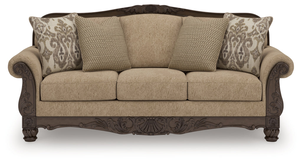 This sofa is a gorgeous example of new traditional design. Its elegant profile and plush cushions merge classic flair with modern comfort. Golden high-luster textured upholstery sets the tone for an easy elegant look, while carved details and decorative turned legs make a grand statement. Inspired by then, reinvented for the here and now.