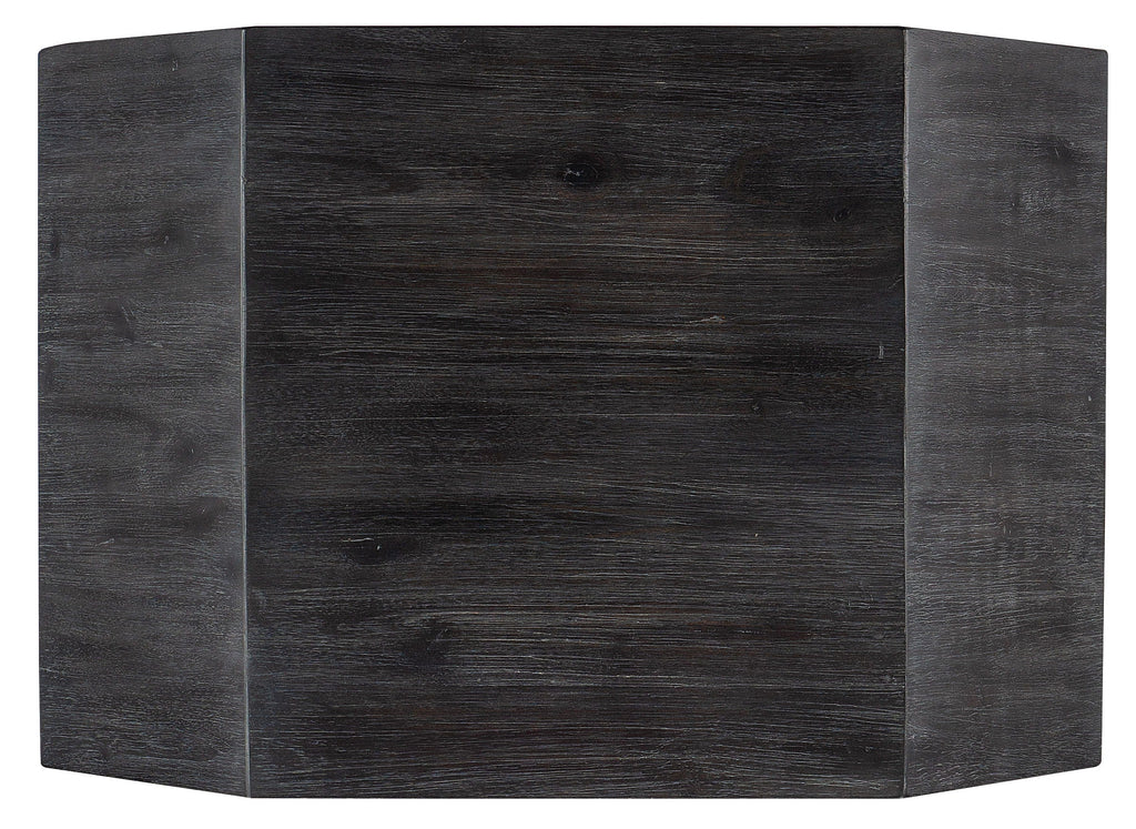 With an exotic smokey finish and stylish hexagonal shape, the Honeycomb End Table is crafted of Acacia Veneers and has one fixed shelf. The transparent black finish reveals color and grain variances in the wood.