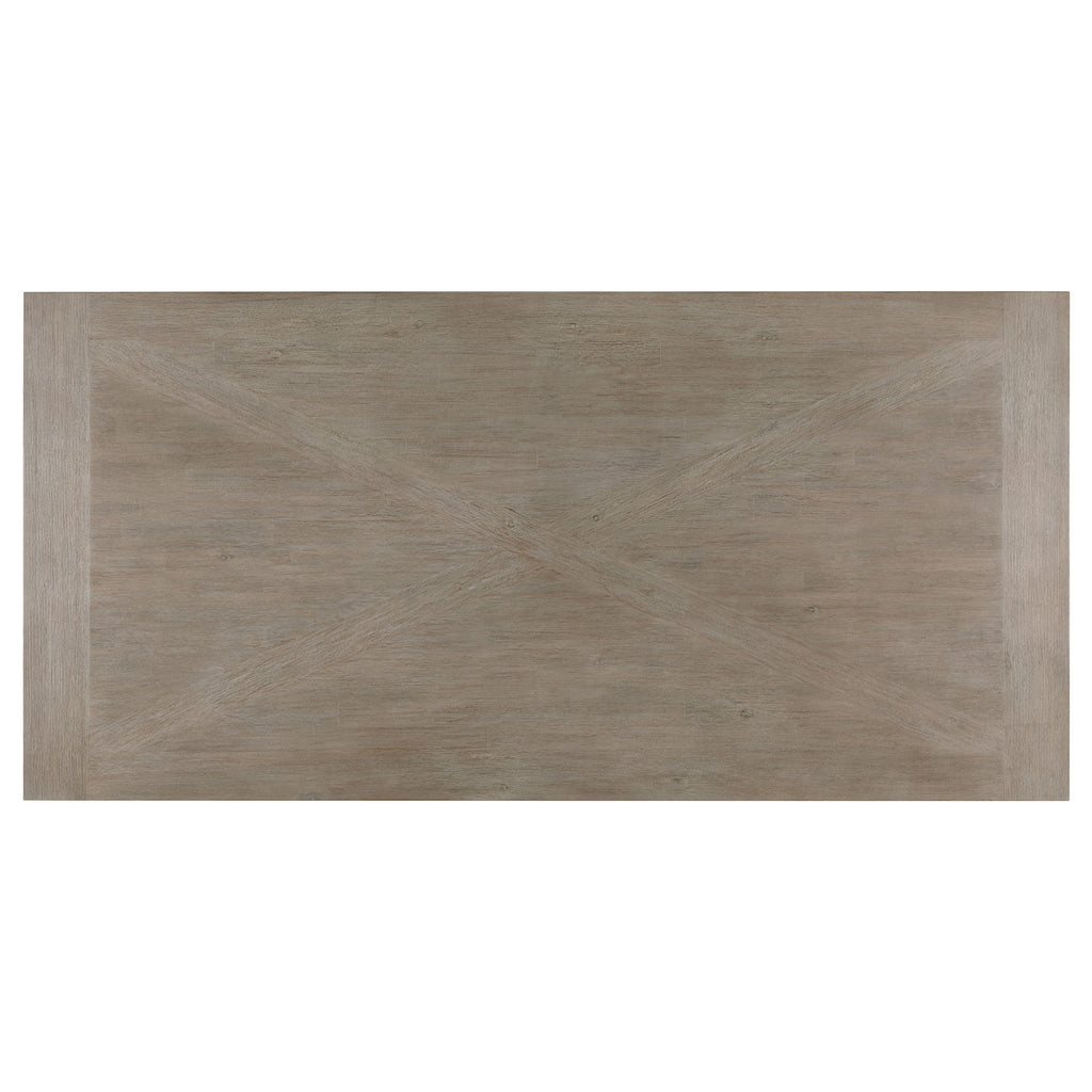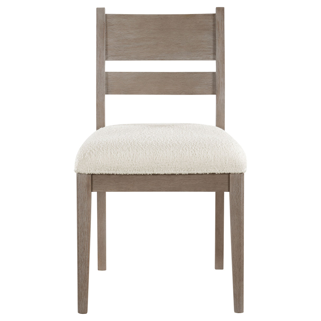 Build an inviting kitchen or dining room with this seven-piece modern farmhouse dining set at its heart. Designed for casual ambiance, it features a rectangular dining table complete with a trestle base with angular details that are sure to draw the eye. A coastal grey finish complements acacia veneer over acacia wood and MDF, creating a strong, durable set that's built to last. The table is a rectangular design to comfortably seat six, perfect for the family or entertaining friends. Six side chairs add modified ladder backs for depth and texture, with creamy upholstery fabric over foam padded seats for exceptional comfort.