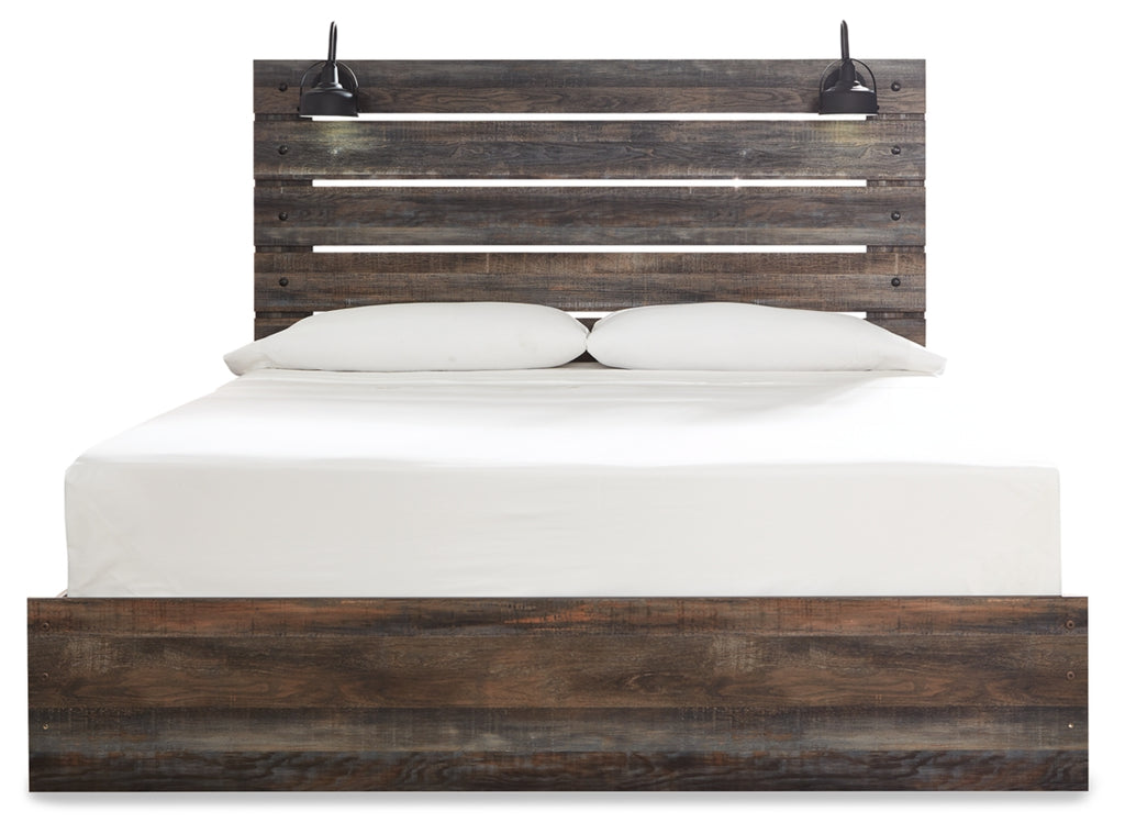 When merged in just the right way, rustic and industrial styles can make one happy marriage. Case in point: this king panel bed. A refined take on barn board beauty, its complex, replicated wood grain showcases hints of burnt orange and teal tones for a sense of weatherworn authenticity. Love to read in bed? You're sure to find the pair of retro-chic light sconces and USB plug-ins on the open-slat style headboard such a bright idea. 2 matching nightstands also included.