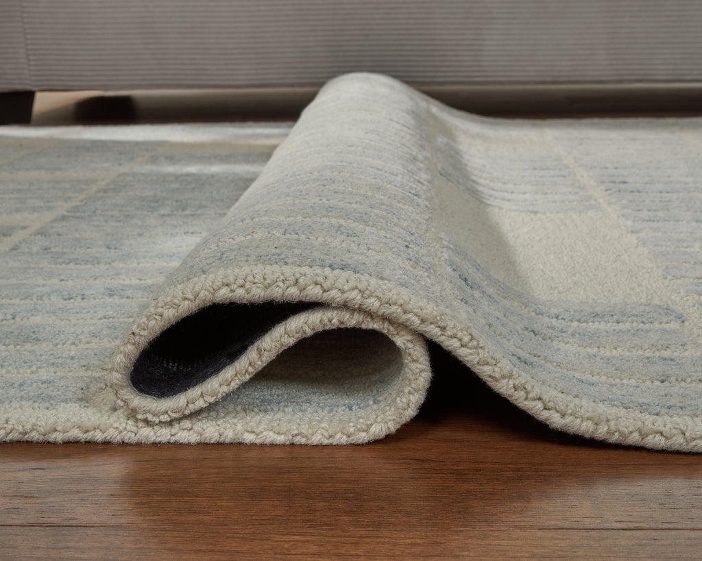 - Hand tufted high-low, geometric design in blue and ivory.