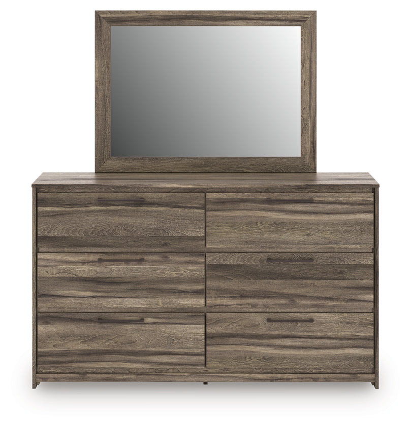 Casually cool style and lots of storage go hand in hand with this bedroom package. A weathered brown finish over replicated oak grain creates an easygoing vibe, setting the scene in your restful retreat. The set's clean lines and modern handles provide a fuss-free look.
