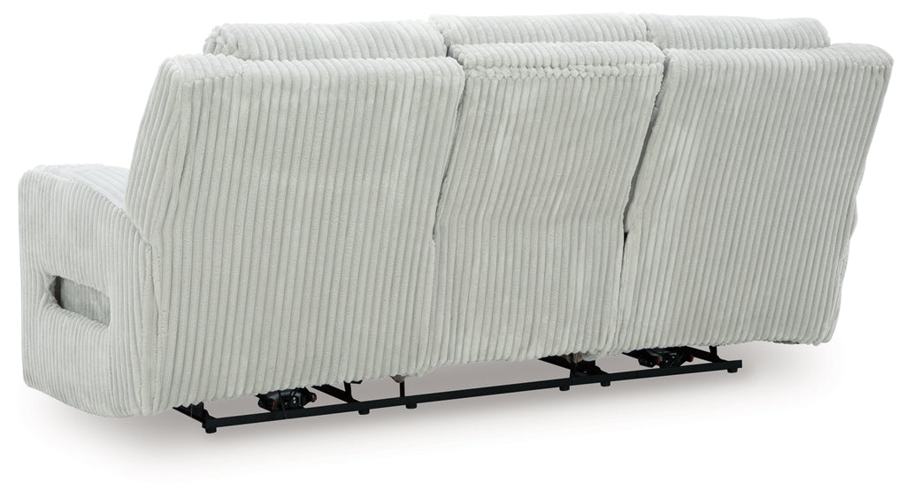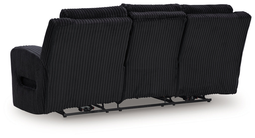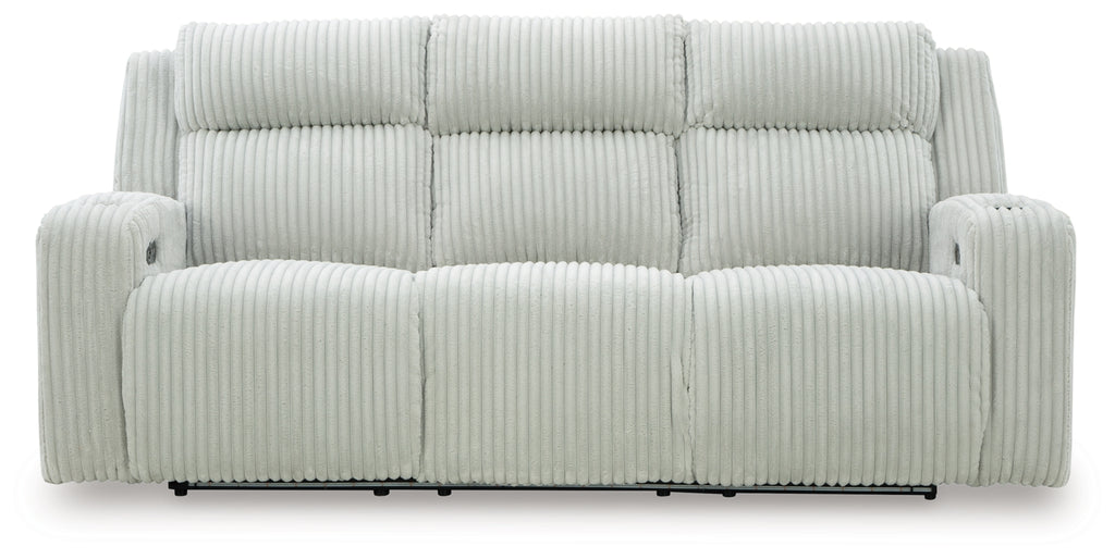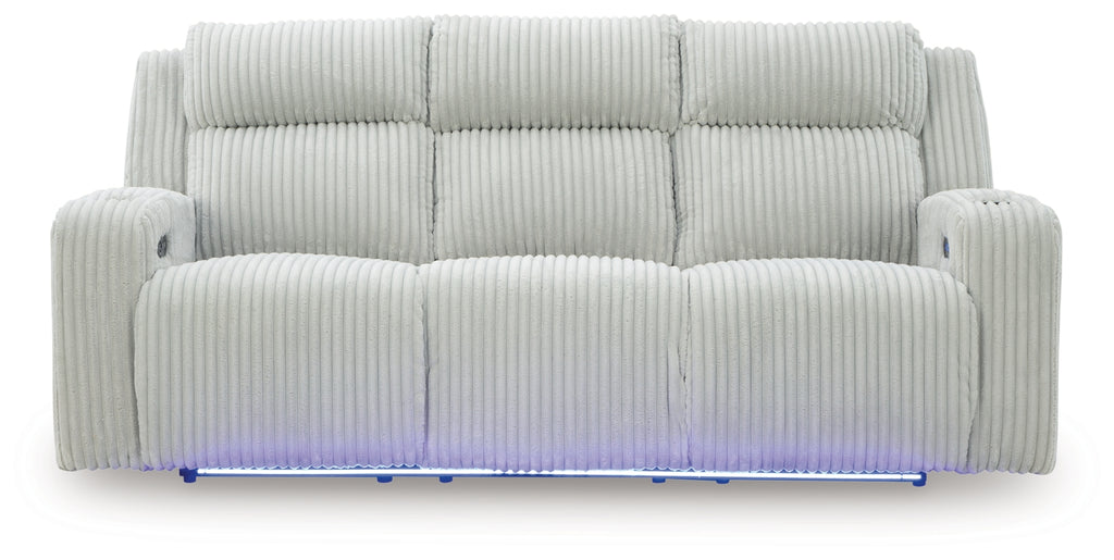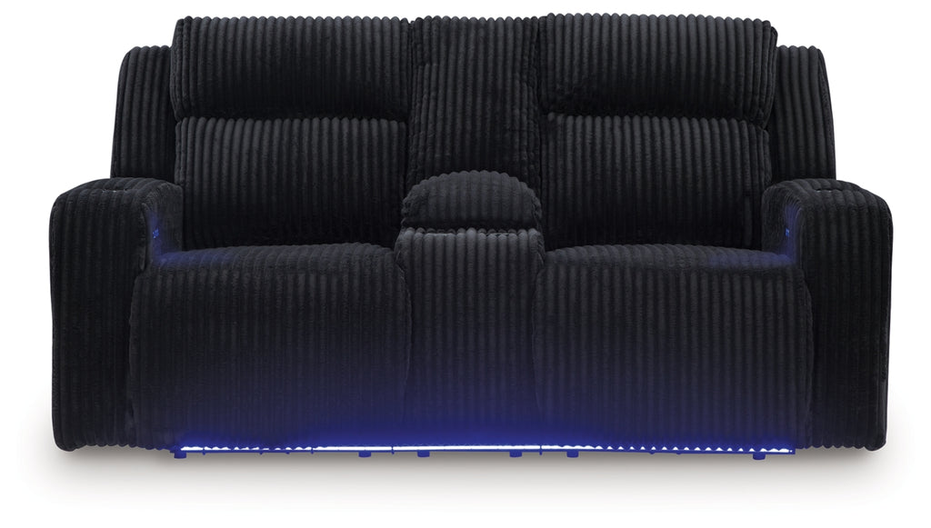 Trend-right style, meet irresistible modern function. Your living room gets a cozy-cool upgrade with this power reclining seating package. Curl up in its ultra-chic corded upholstery and recline with one-touch controls. Is it movie night or game time? With ambient LED lighting, this set transforms from a serene relaxation spot to an entertainment hub. USB charging, cup holders and storage cutouts make lounging all the more convenient.
