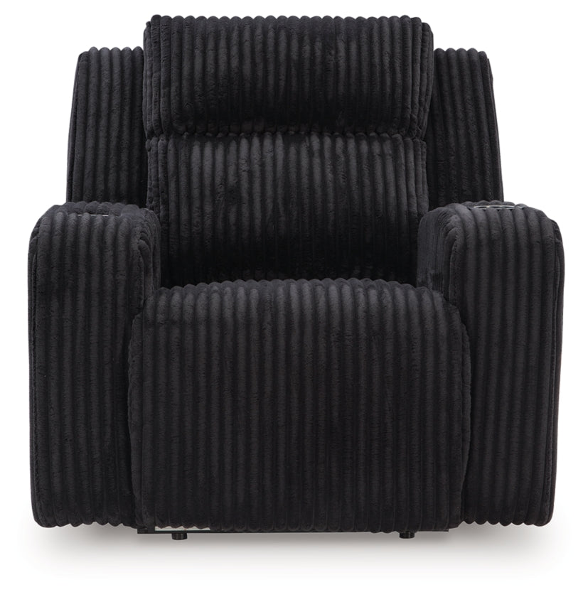 Trend-right style, meet irresistible modern function. Your living room gets a cozy-cool upgrade with this power reclining seating package. Curl up in its ultra-chic corded fabric and recline with one-touch controls. Is it movie night or game time? With ambient LED lighting, this set transforms from a serene relaxation spot to an entertainment hub. USB charging, cup holders and storage cutouts make lounging all the more convenient.