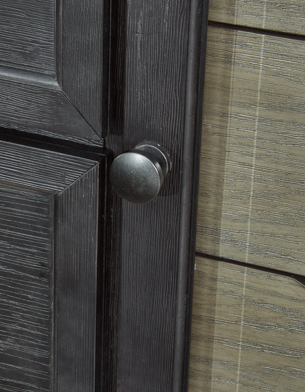 - Two-tone color scheme featuring a rich brushed black main color accented with a beautiful dusty grayish brown wood tone.