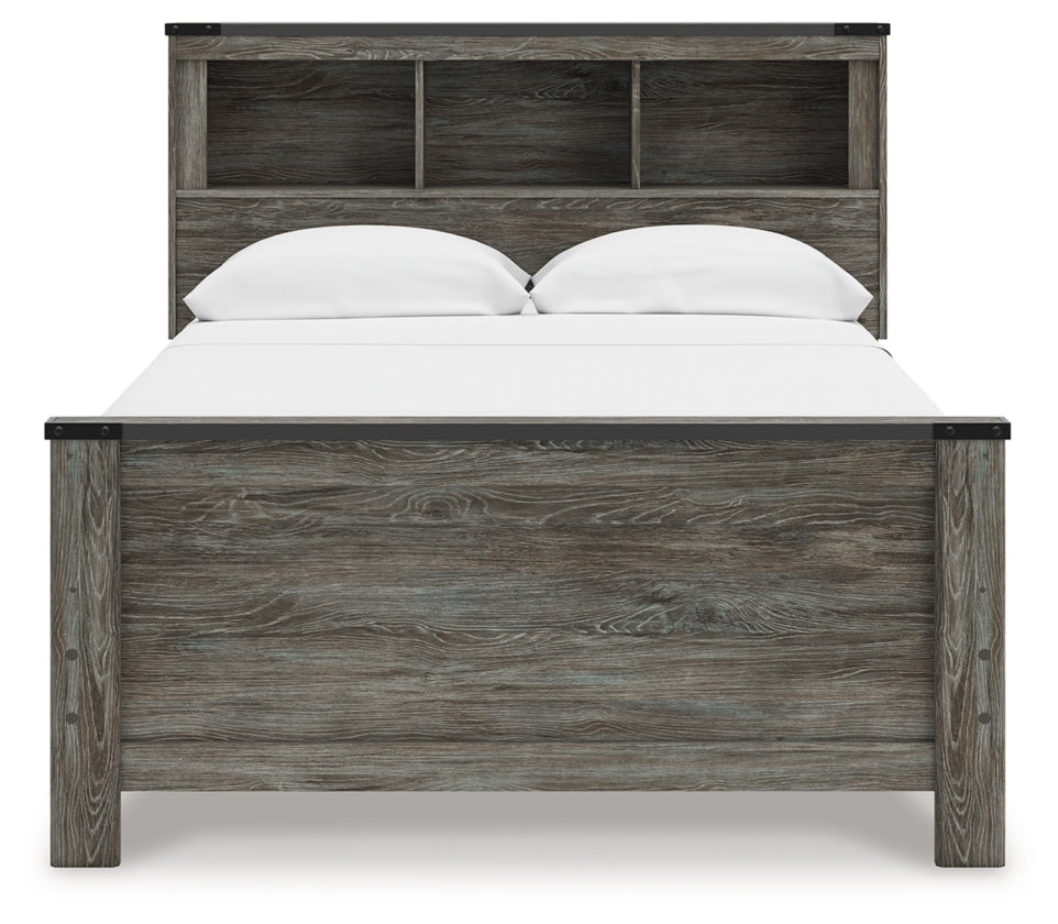 Cool, casual style is for all ages. With this full bookcase panel bed, they get the function they need plus the refined design you love. Approachably neutral in a rustic warm gray, it’s adaptable enough to pair with an assortment of existing colors and room decor. Faux metal detailing with nailhead accents lends an industrial edge. And handy storage cubbies in the headboard keep books, toys and other bedtime necessities within easy reach.