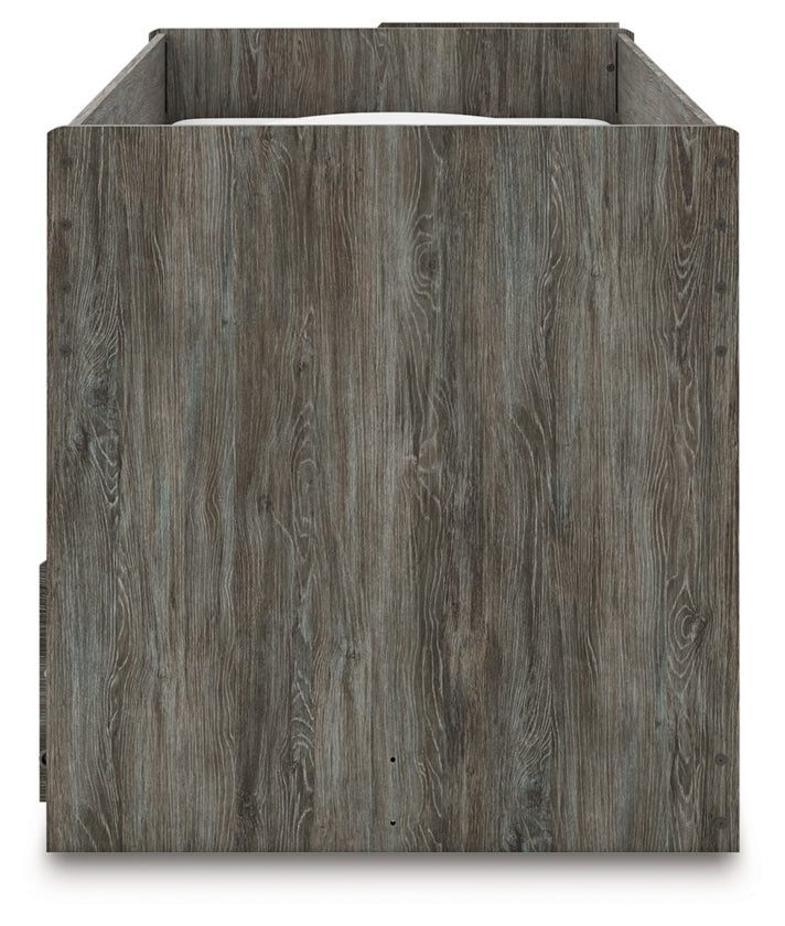 Cool, casual style is for all ages. With this bedroom package, they get the function they need plus the refined design you love. Approachably neutral in a rustic warm gray, this set is adaptable enough to pair with an assortment of existing colors and decor. The faux metal detailing with nailhead accents lends an industrial edge.