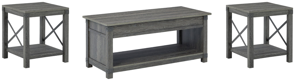 Raise the bar on modern farmhouse design with this accent table set. Sporting a grayish brown replicated wood grain effect, the coffee table's handy spring-loaded mechanism brings the tabletop closer to you. This versatile table makes it easier than ever to eat, work or play from the comfort of your sofa. A pair of coordinating end tables completes the set in style.