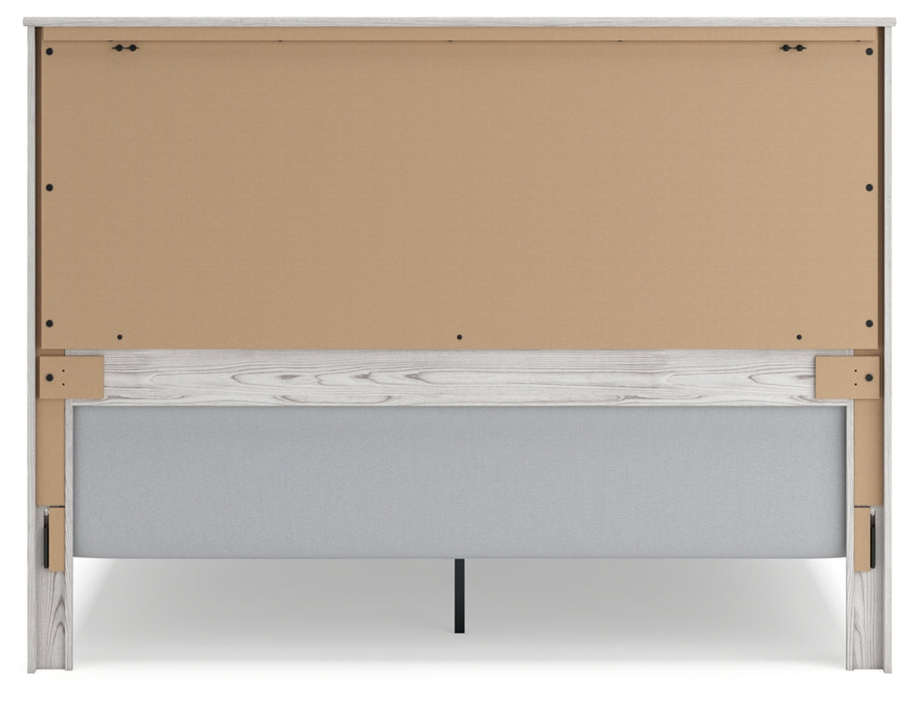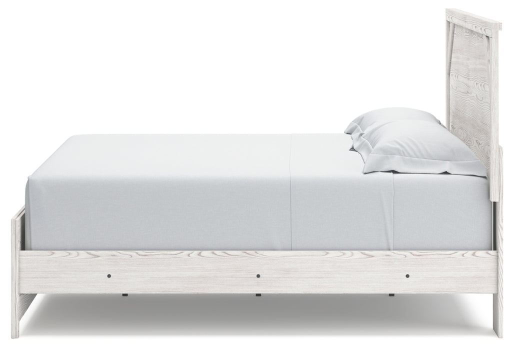 Cool, clean and casually modern. This king panel bed’s white rustic finish sets the tone for your calming sanctuary. Matte black sconce lights and an abstract design on the headboard bring a fresh look to the bed’s simply stunning profile.