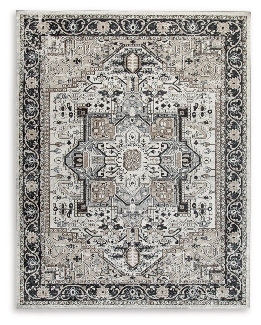 - Machine woven antiqued medallion design in cream, taupe, brown, gray, and black.