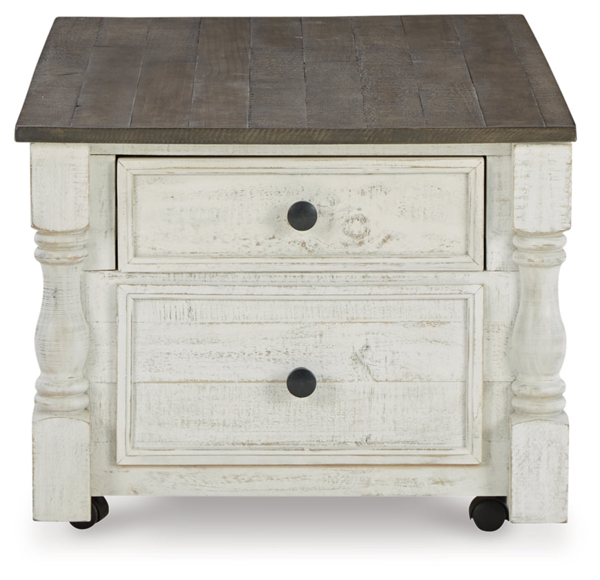 What a fresh interpretation of country classic style. Inspired by American farmhouse craftsmanship, but with an elevated sensibility, this occasional table set blends distinctive details such as turned post accents and raised drawer fronts for a substantial look that feels right at home. Those who appreciate rustic character should take note of the table’s thick crown moulding, beautified with a vintage two-tone finish. It features four storage drawers, a small concealed storage tray under the lift-top, and robust legs that are ready to stand the test of time.