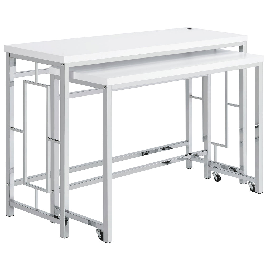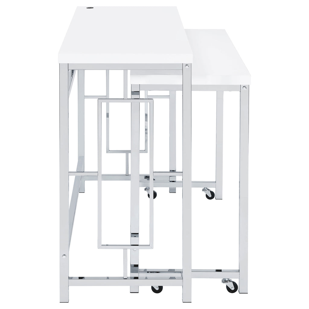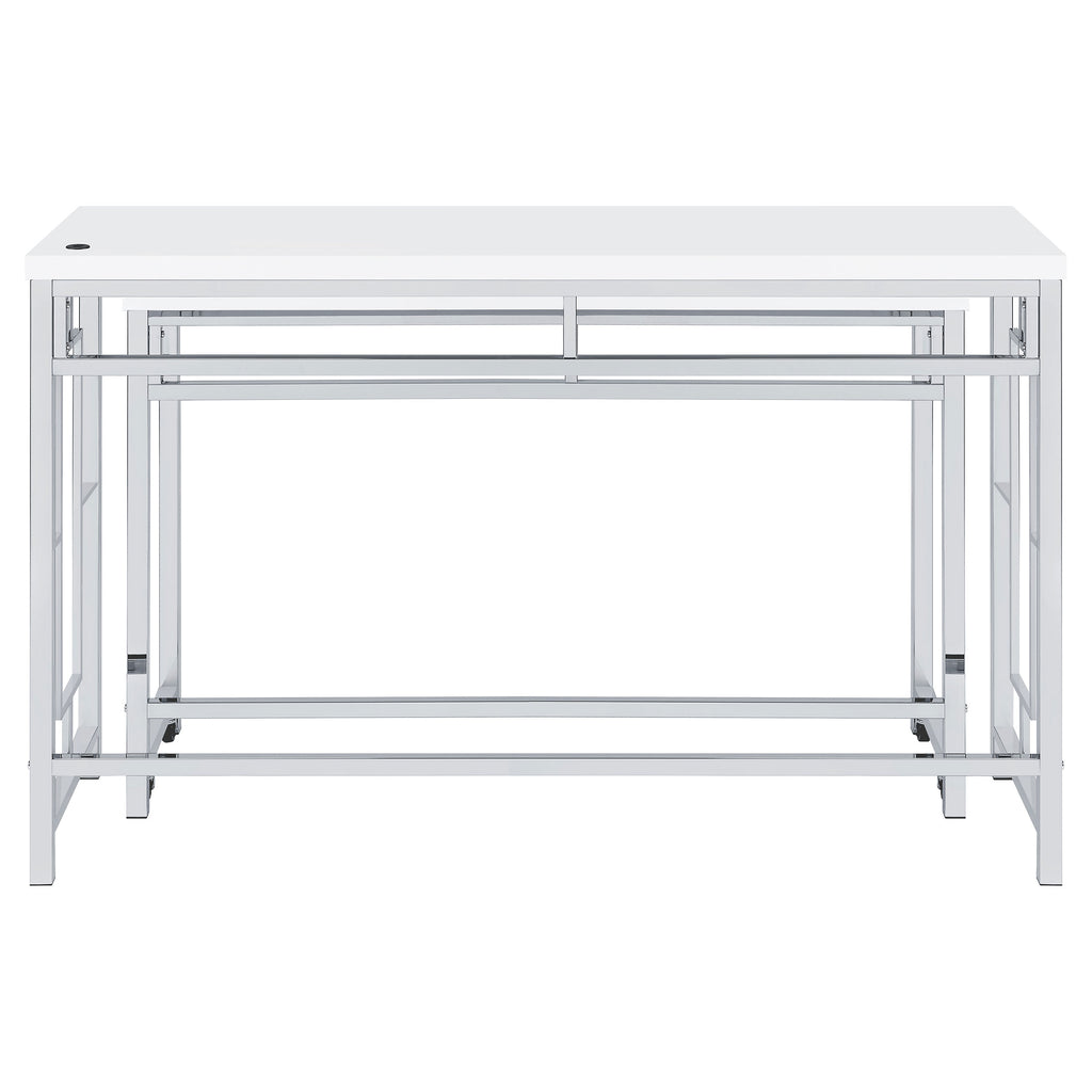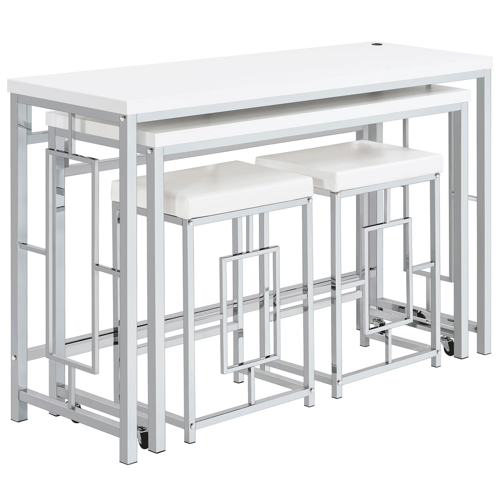 You'll fall in love with the versatility and impeccable styling of a contemporary four-piece counter height dining table set that includes two nesting tables and two backless stools. Whether you're dining or working from home, the set is designed to impress, with a larger table and a smaller table on wheels that tucks underneath, creates a waterfall effect, or can be positioned in an L-shape for working from home. Its crisp white and silver finish combination highlights artistic design. The set is complete with open sides and stool bases accentuated with floating frames to bring Deco character. The large tabletop is equipped with a USB port perfect for your phone.