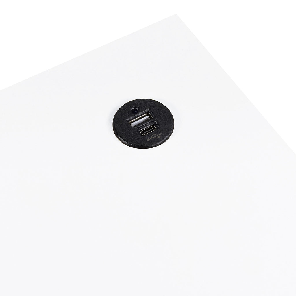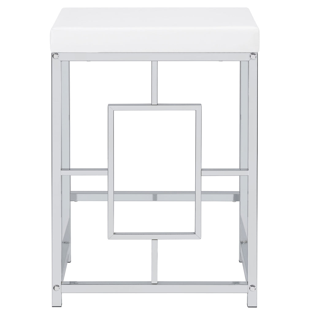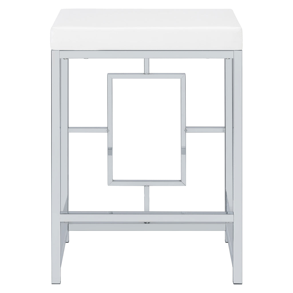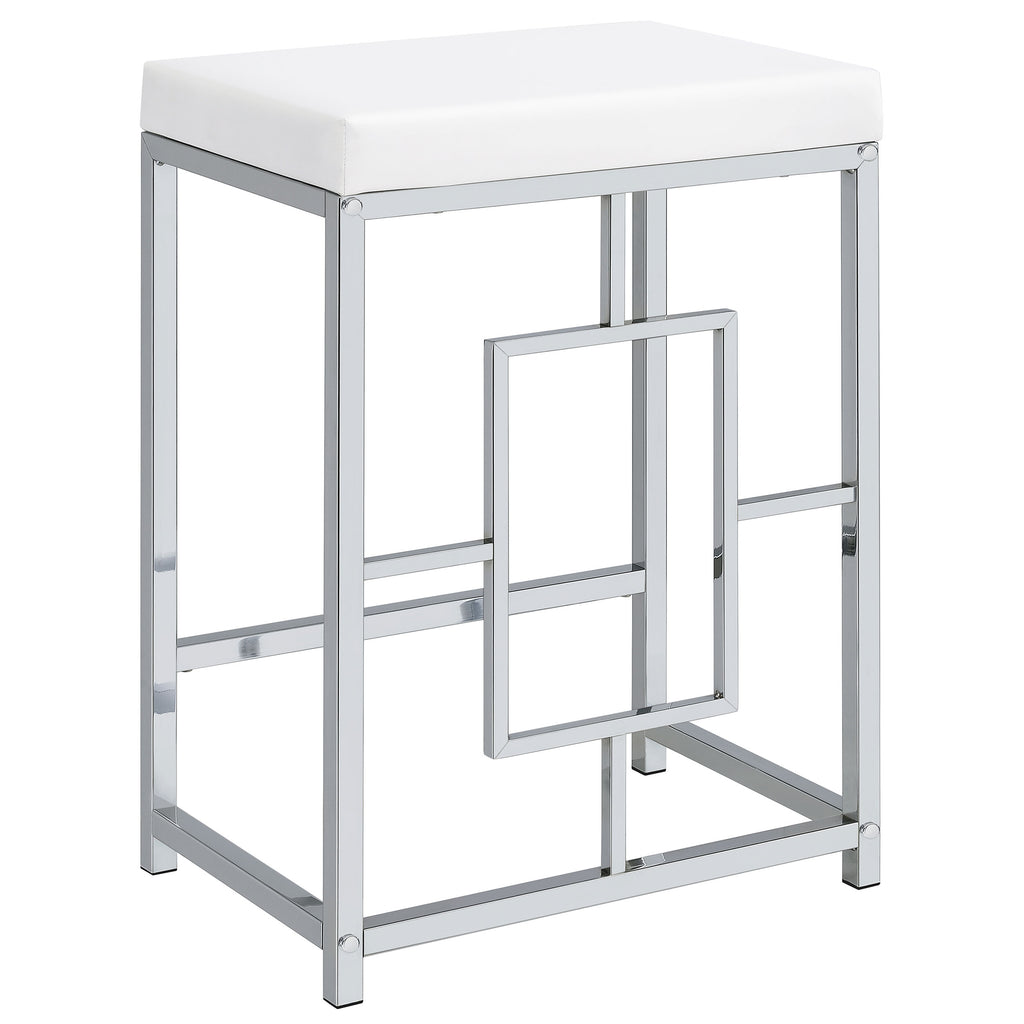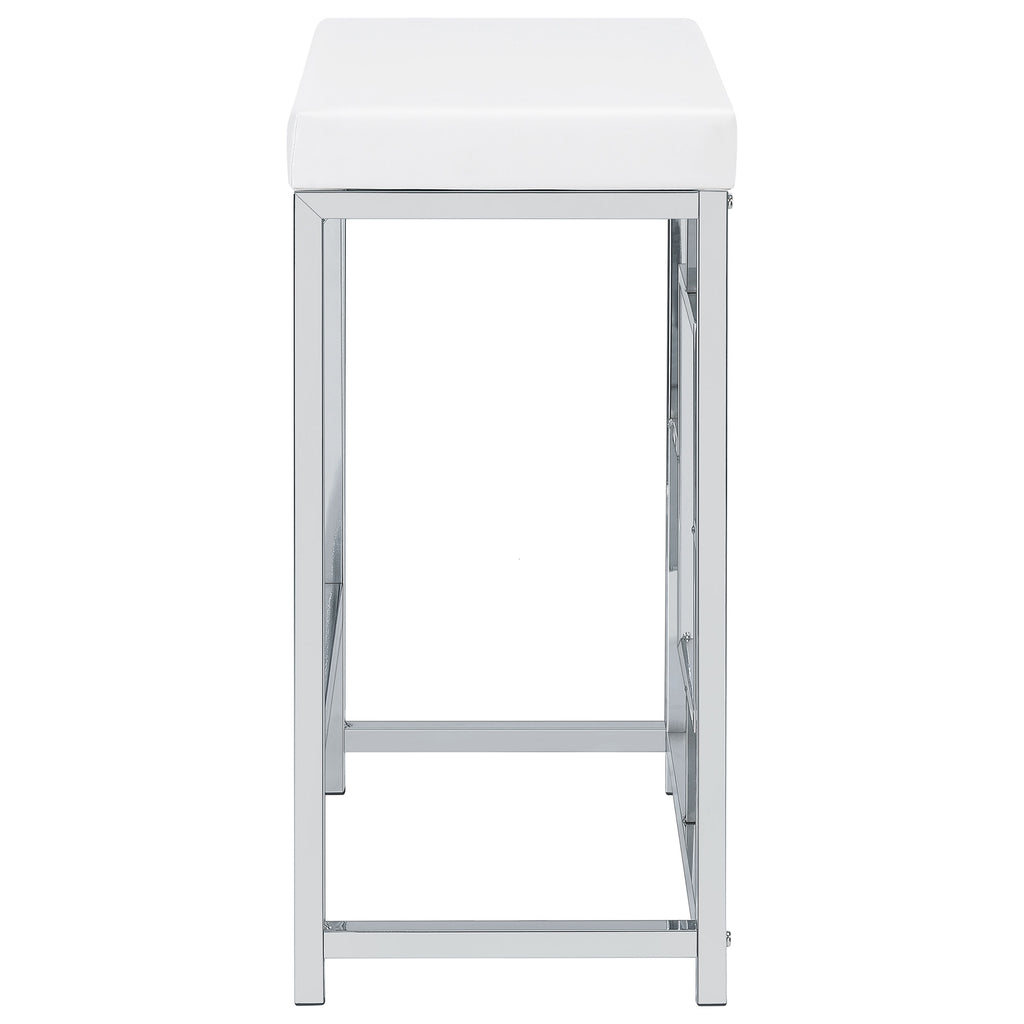 You'll fall in love with the versatility and impeccable styling of a contemporary four-piece counter height dining table set that includes two nesting tables and two backless stools. Whether you're dining or working from home, the set is designed to impress, with a larger table and a smaller table on wheels that tucks underneath, creates a waterfall effect, or can be positioned in an L-shape for working from home. Its crisp white and silver finish combination highlights artistic design. The set is complete with open sides and stool bases accentuated with floating frames to bring Deco character. The large tabletop is equipped with a USB port perfect for your phone.