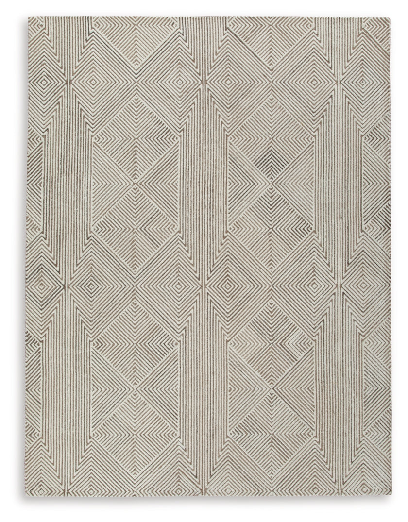 - Hand tufted, geometric design in beige and brown.
