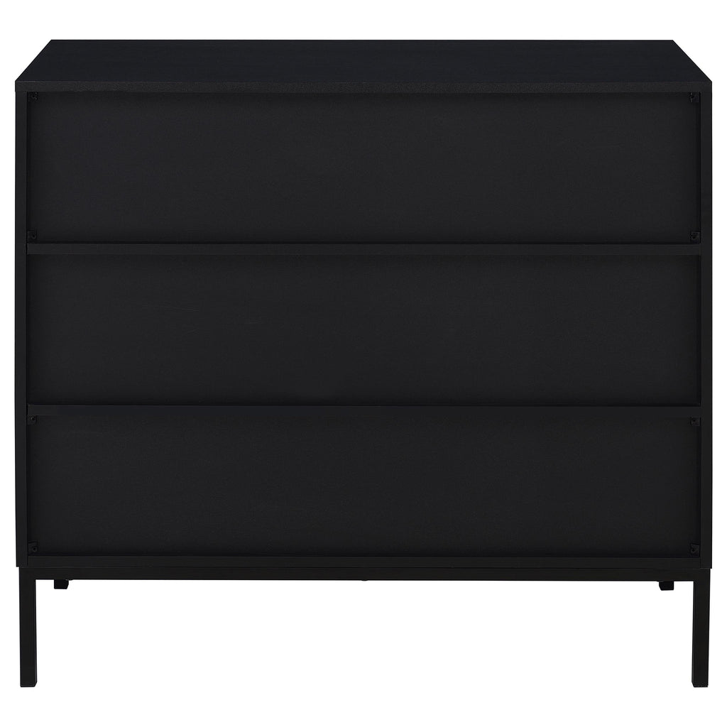 Enhance your dining or living space with this sleek black sideboard, elegantly shaped with subtle arches and showcasing framed fluted tempered glass doors. Inside, adjustable shelves provide flexible storage for dinnerware and décor, while its minimalist profile rests on slender metal legs for a refined touch. Constructed from engineered wood and laminate veneer, this versatile piece blends durability, easy maintenance, and understated style, seamlessly complementing modern interiors.